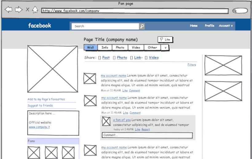 Bei WireFrames geht es darum, deine Benutzeroberfläche grob zu skizzieren. Hier am Beispiel von Facebook (Quelle: https://bit.ly/2OMg9ra)
