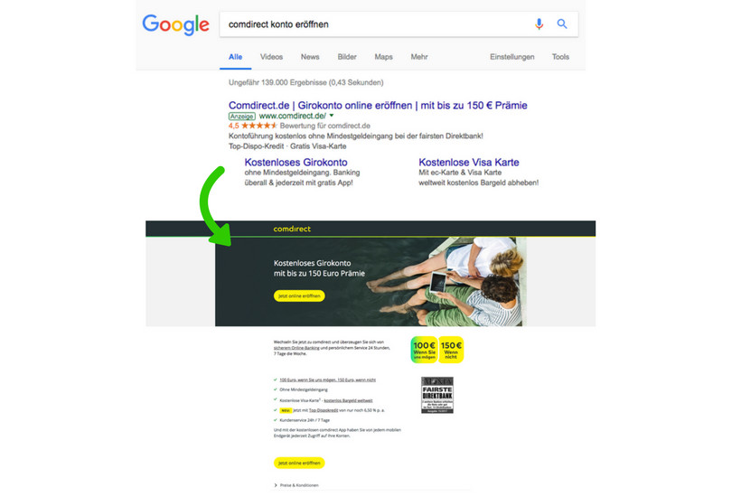 Ein sehr gutes Beispiel liefert hier comdirect. Alle wichtigen Elemente der AdWords-Anzeige finden sich intuitiv und schnell erkennbar auf der Landing Page wieder.