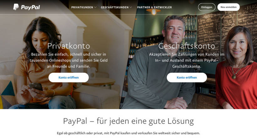 Die Landing Page von PayPal spielt im Hero Shot gekonnt mit Visuals der beiden Zielgruppen (Quelle: paypal.com/de).
