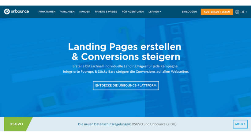 Ein sehr gutes Beispiel hierfür ist die Landing Page von unbounce, eines Landing Page Baukasten-Anbieters. Wenn jemand Headline, Subheadline und Value Proposition beherrschen sollte, dann diese Anbieter.