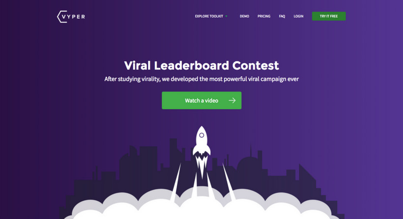 Vyper möchte auf der unteren Landing Page als Conversions-Ziel unbedingt erreichen, dass du zuerst ein Video ansiehst. Höchstwahrscheinlich können sich viele User unter einem „Viral Contest Leaderboard“ im ersten Moment nicht viel vorstellen. Ein Erklärvideo scheint aber für eine höhere Conversion Rate zu sorgen. Deshalb lautet der CTA auch sprechend „Watch a video“.