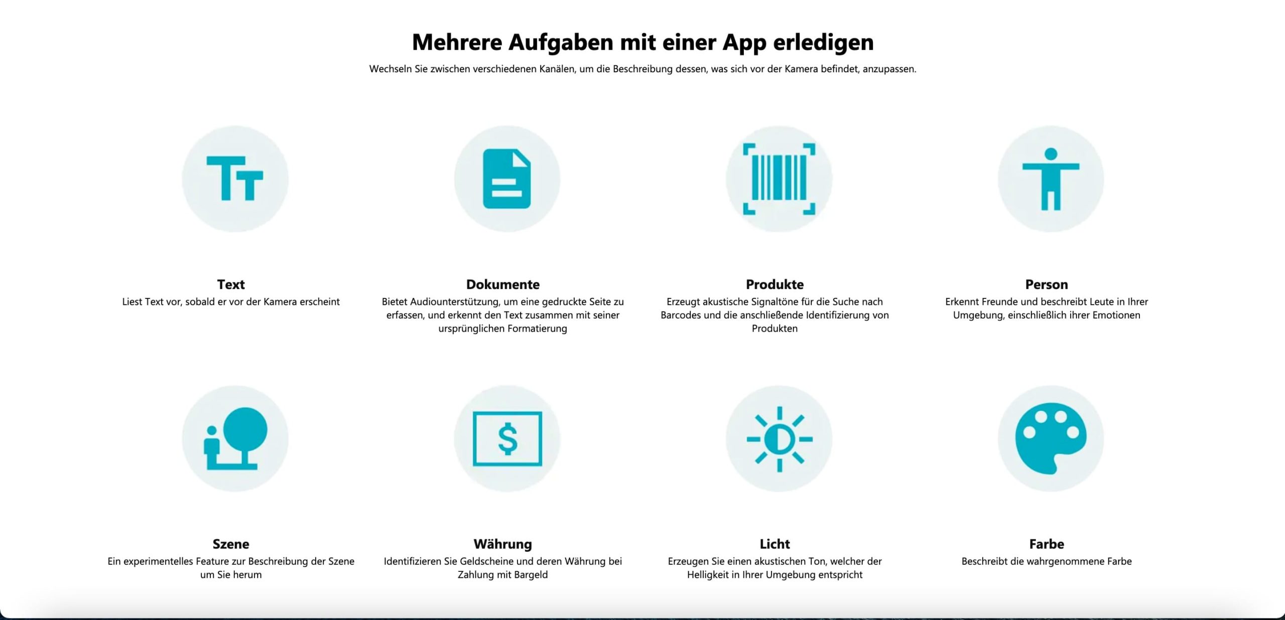 Die App Seeing AI der Firma Microsoft soll Sehbehinderten helfen sich besser in der Welt zurechtzufinden. Die künstliche Intelligenz scannt die Umwelt ab und gibt per Sprachausgabe dem User Informationen über seine Umwelt.