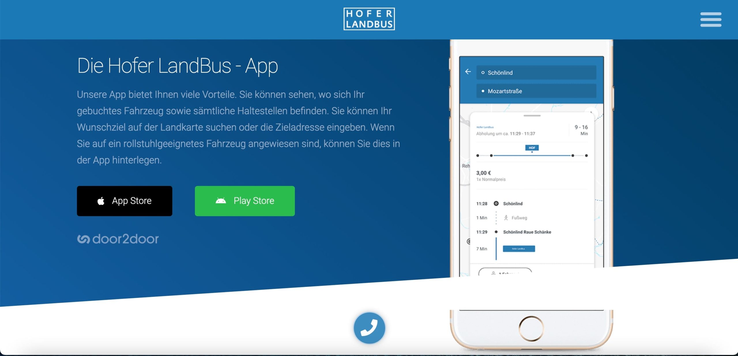 Ein ähnliche Idee ist beispielsweise der Hofer Landbus des Landkreises Hof. Der Landbus ist ein innovatives Mobilitätsangebot, der keinen festen Fahrplan hat und per App angefordert werden muss. Dabei kann man beobachten, wo sich das angeforderte Fahrzeug befindet und die benötigten Haltestellen liegen.