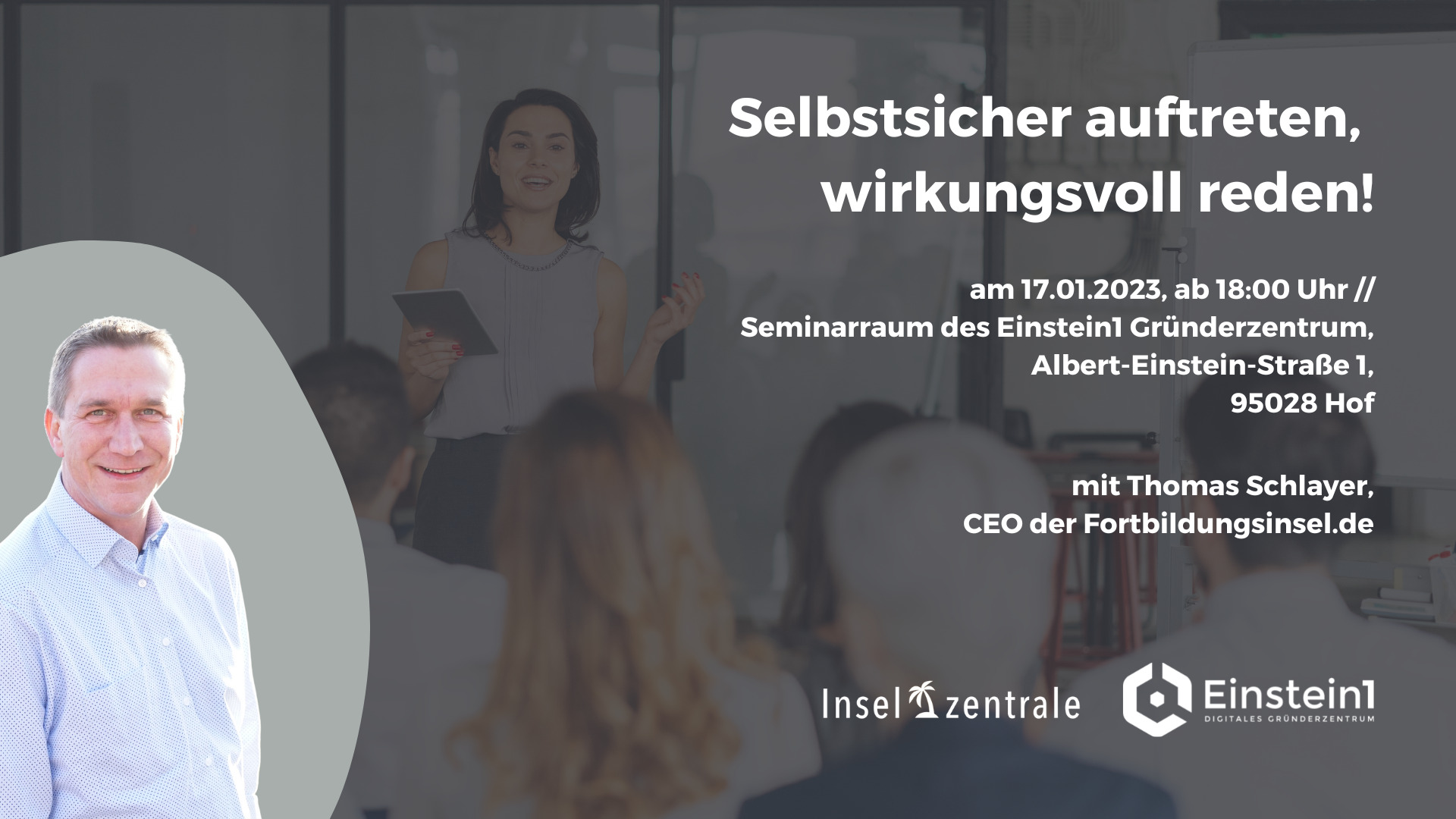 Es ist nicht nur wichtig, sein Produkt oder seine Dienstleistung richtig zu vermarkten, sondern auch sich selbst. Auch für Gründer:innen ist das Selbstmarketing besonders wichtig – insbesondere wenn es darum geht, potenzielle Investoren und andere wichtige Key Partner von ihrer Vision zu überzeugen.Um auch Sie aktiv bei Ihrer Selbstvermarktung zu unterstützen, haben wir bereits zum dritten Mal Thomas Schlayer, Geschäftsführer der Schlayer.net GmbH zu uns ins Einstein1 eingeladen. Herr Schlayer wird Euch zahlreiche Tipps und Tricks näherbringen, selbstsicher aufzutreten und dadurch wirkungsvoll zu reden.