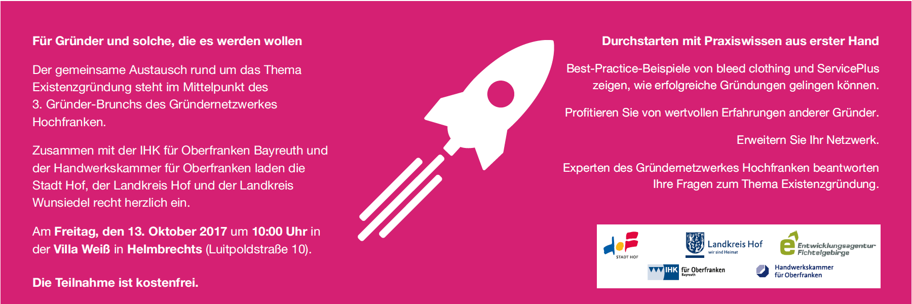 Die Stadt Hof, der Landkreis Hof und der Landkreis Wunsiedel laden Euch zusammen mit der IHK für Oberfranken Bayreuth, der Handwerkskammer für Oberfranken und dem Netzwerk Digitales Gründerzentrum Hof herzlich ein.