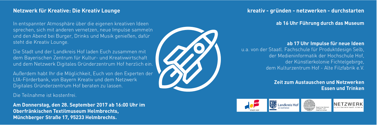 Im Textilmuseum in Herlmbrechts bieten wir mit der Kreative Lounge einen Rahmen für deine unternehmerische Stoffsammlung. Du kannst Infos tanken, Wege diskutieren, Denkanstöße sammeln, dein Netzwerk auszubauen und erste Hilfe bei Fragen, die vielen Existenzgründern auf den Nägeln brennen bekommen.