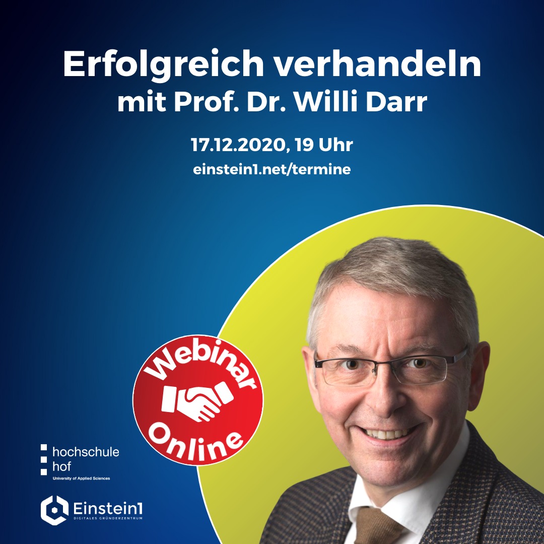 Am Digital Donnerstag, den 17.12.2019 um 19 Uhr, lädt Einstein1 zum Webinar „Erfolgreich verhandeln“ mit Prof. Dr. Willi Darr ein.