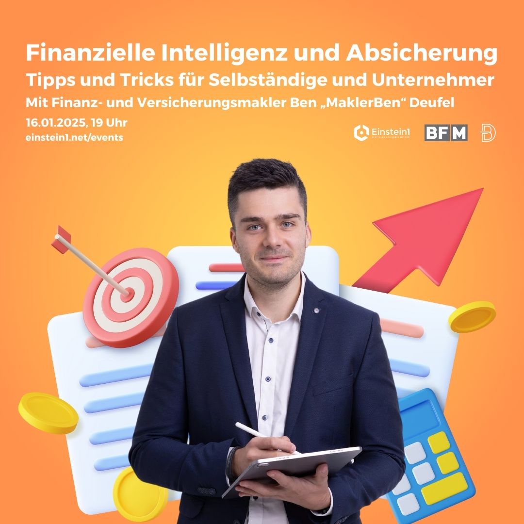 Am 16.01.2025 um 19 Uhr laden das Digitale Gründerzentrum Einstein1 und das BF/M-Bayreuth zu einem informativen und praxisnahen Vortrag ein. Unter dem Motto „Finanzielle Intelligenz und Absicherung – Tipps und Tricks für Selbständige und Unternehmer“ teilt der unabhängige Finanz- und Versicherungsmakler Ben „MaklerBen“ Deufel wertvolle Einblicke und praktische Tipps.