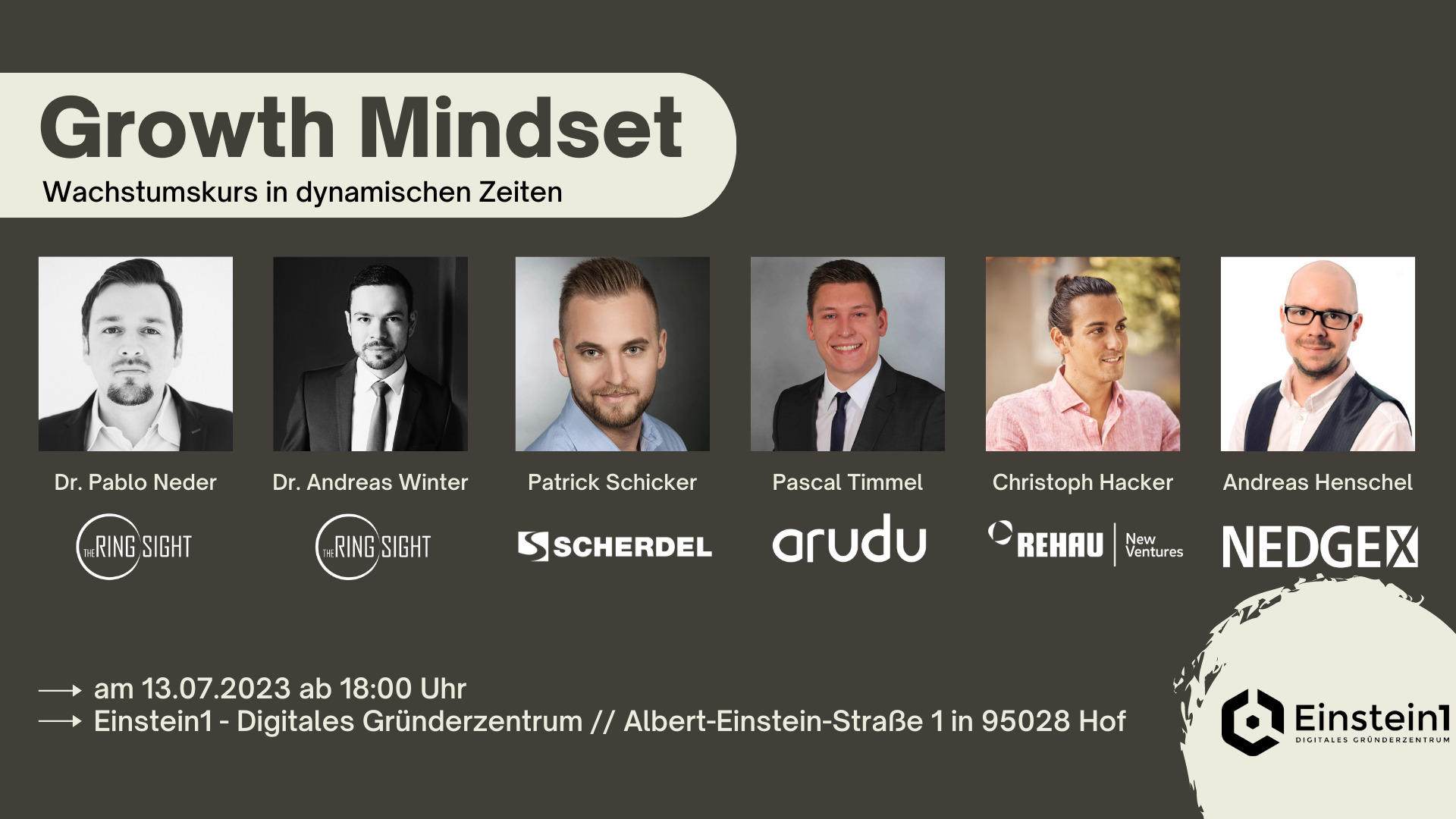 Die Veranstaltung besteht aus zwei Teilen. Im ersten Teil zeigen Dr. Pablo Neder und Dr. Andreas Winter von The Ringsight GmbH in einem Impulsvortrag auf, warum erfolgreiches Wachstum bereits im Kopf beginnt und wie ein Growth Mindset, ergänzt mit der Lean-Startup-Methode, dazu beitragen kann. Im zweiten Teil der Veranstaltung diskutieren wir gemeinsam mit Patrick Schicker (SCHERDEL GmbH), Christoph Hacker (REHAU New Ventures GmbH), Andreas Henschel (NEDGEX GmbH) und Pascal Timmel (ARUDU) über ihre Erfahrungen und Best Practices aus der Praxis und welche Insights und Impulse sie dem Publikum für deren Weg zur Unternehmer-Kultur mitgeben können.