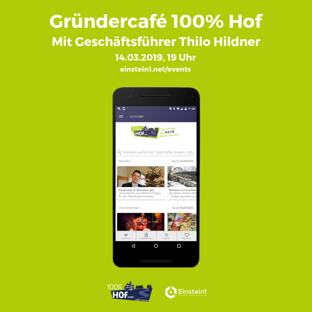 Am Digital Donnerstag, den 14.03.2019 um 19 Uhr, lädt das Digitale Gründerzentrum Einstein1 zum kostenlosen Gründercafé mit Thilo Hildner von 100% Hof ein.