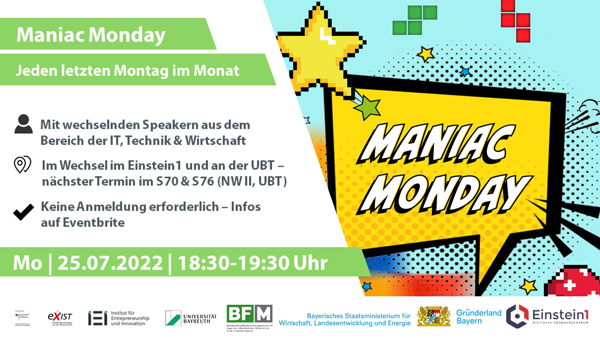 Willkommen beim Maniac Monday, organisiert vom Einstein1 gemeinsam mit der Universität Bayreuth sowie dem BF/M-Bayreuth. Jeden letzten Montag im Monat erwartet euch ab 18.30 Uhr ein spannender Abend mit informativen Vorträgen und einem einzigartigen Networking im Anschluss.