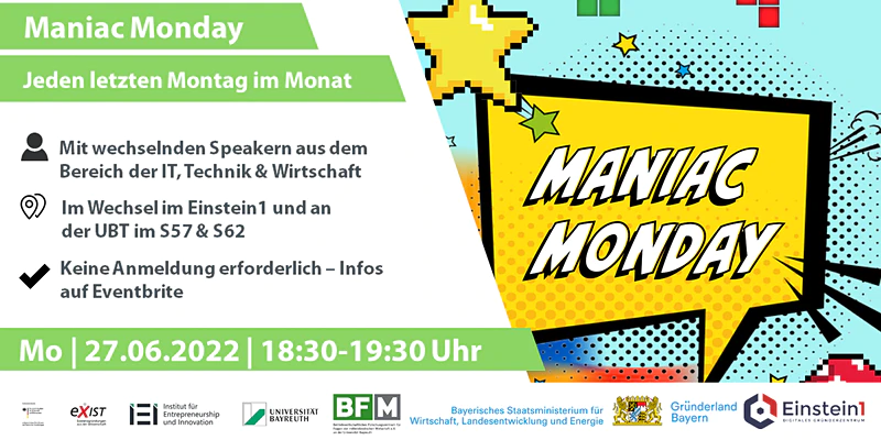 Willkommen beim Maniac Monday der Universität Bayreuth, dem Gründungszentrum in Hof Einstein1 und dem BF/M Bayreuth. Jeden letzten Montag im Monat erwartet euch ab 18.30 Uhr ein spannender Abend mit informativen Vorträgen und einem einzigartigen Networking im Anschluss.