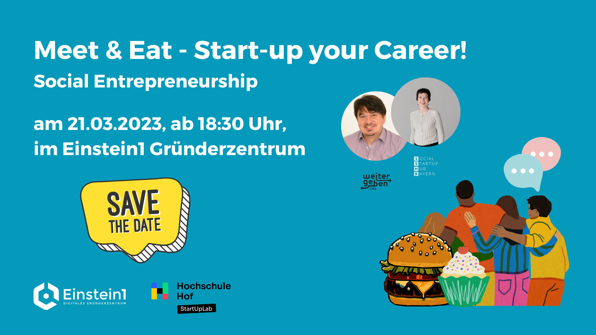 Wir – das Einstein1 Gründerzentrum gemeinsam mit dem StartUpLab und dem Career Service der Hochschule Hof – wollen Euch mit der Eventserie „Meet & Eat – Start-up your Career!“ für die Gründung selbst, sowie das Arbeiten in Start-ups als wertvolle Alternativen für die berufliche Karriere sensibilisieren; saugt dabei unter anderem das Mindset vom Einstein1 und dem StartupLab der Hochschule auf und genießt zudem in entspannter Brown-Bag-Atmosphäre interessante Beiträge rund um Gründungen als Karriereweg!