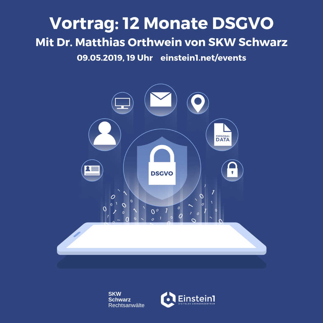 Am Digital Donnerstag, den 09.05.2019 um 19 Uhr, lädt das Digitale Gründerzentrum Einstein1 zum kostenlosen Vortrag „12 Monate DSGVO“ mit dem Datenschutzrechtsexperten Dr. Matthias Orthwein (LL.M. Boston) von SKW Schwarz Rechtsanwälte aus München ein.