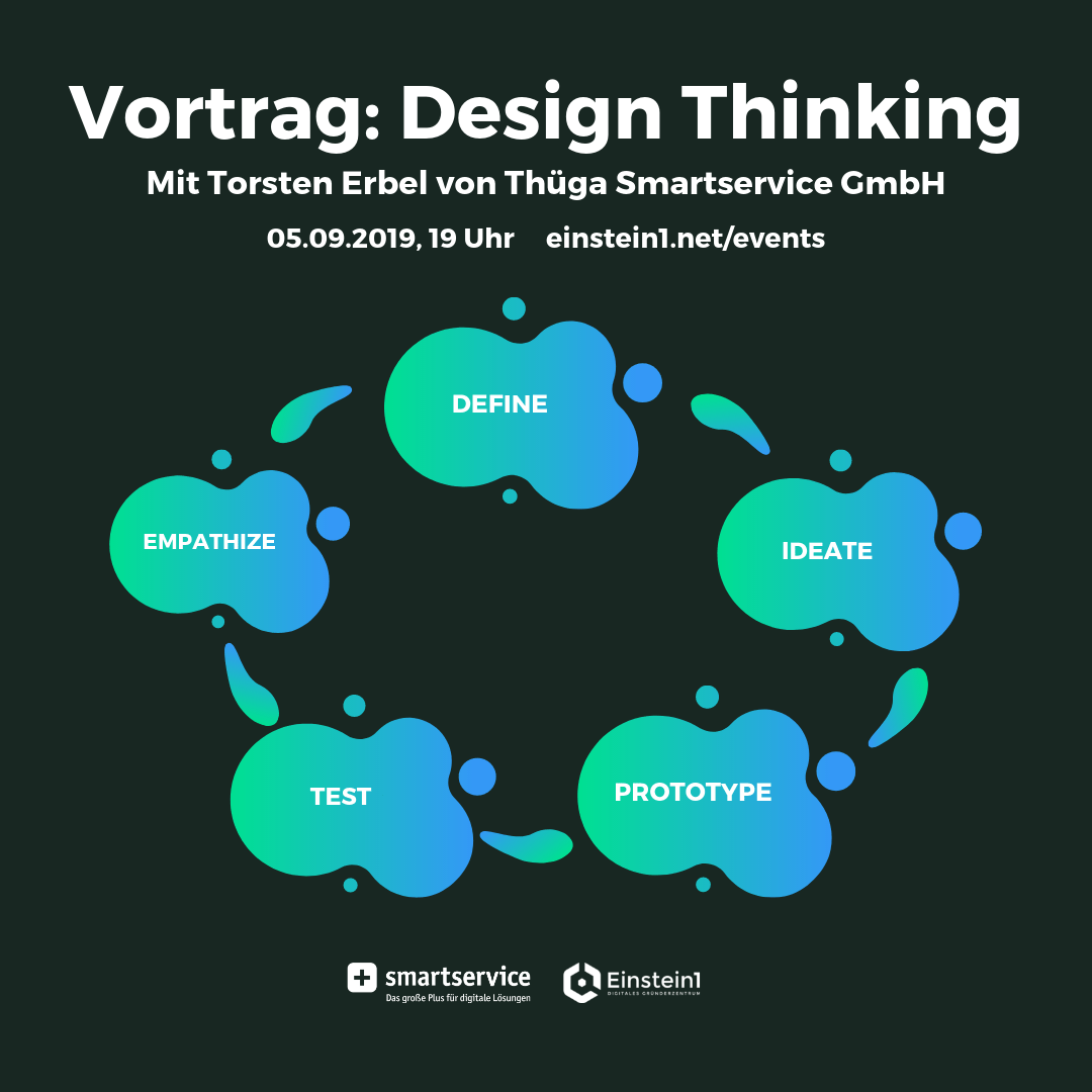 Am Donnerstag, den 05.09. um 19 Uhr, lädt das Digitale Gründerzentrum Einstein1 zum kostenlosen Vortrag “Design Thinking” mit Torsten Erbel von Thüga Smartservice GmbH ein.