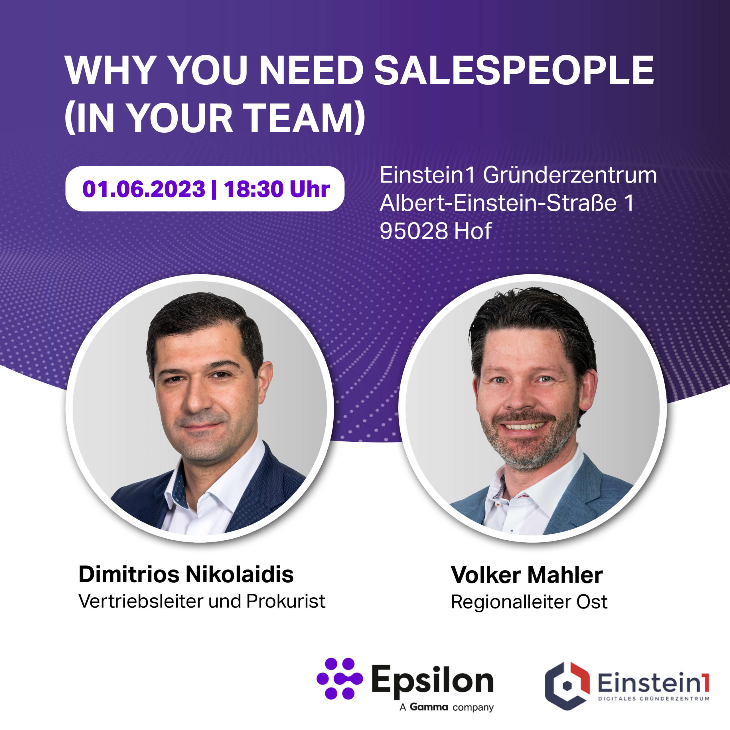 Wir laden dich herzlich ein zu unserer Veranstaltung „Why you need Salespeople (in your Team)“. Lerne von erfahrenen Vertriebsprofis, wie du deine Zielgruppe definierst, deine Botschaft formulierst und deine Abschlussrate erhöhst. Dimitrios Nikolaidis und Volker Mahler von Epsilon Telecom GmbH werden mit ihrer Expertise erklären, warum auch Start-ups ihren Fokus auf Vertriebsthemen legen sollten.