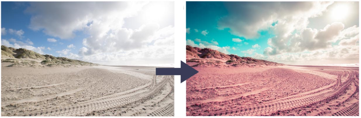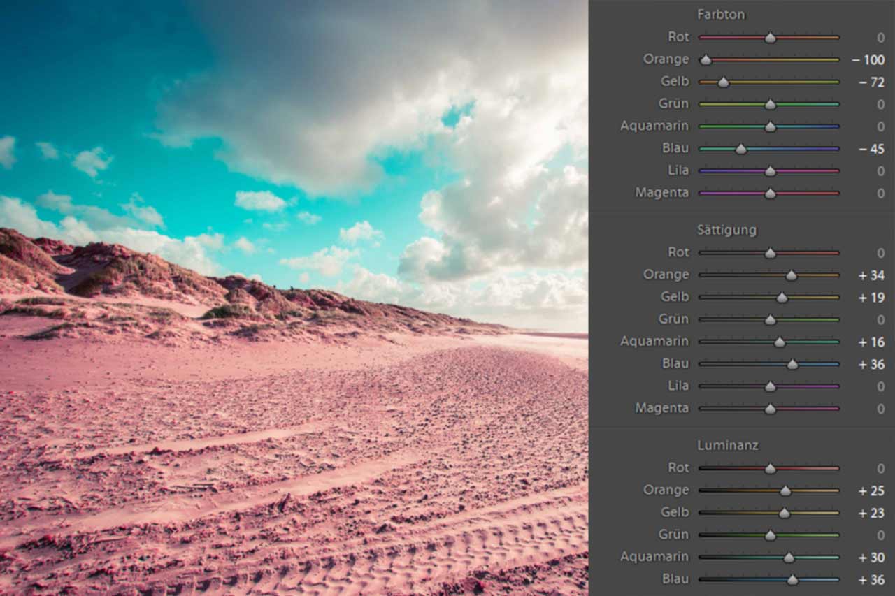 Bei der Bearbeitung von Instagram-Bildern solltest du darauf achten, dass du zuerst Gelb- und Orangetöne mehr ins Rötliche verschiebst. Außerdem suchst du dir alle möglichen Blautöne heraus. Das können alle Abstufungen von Blau, über Aquamarin bis zu Violett, sein.