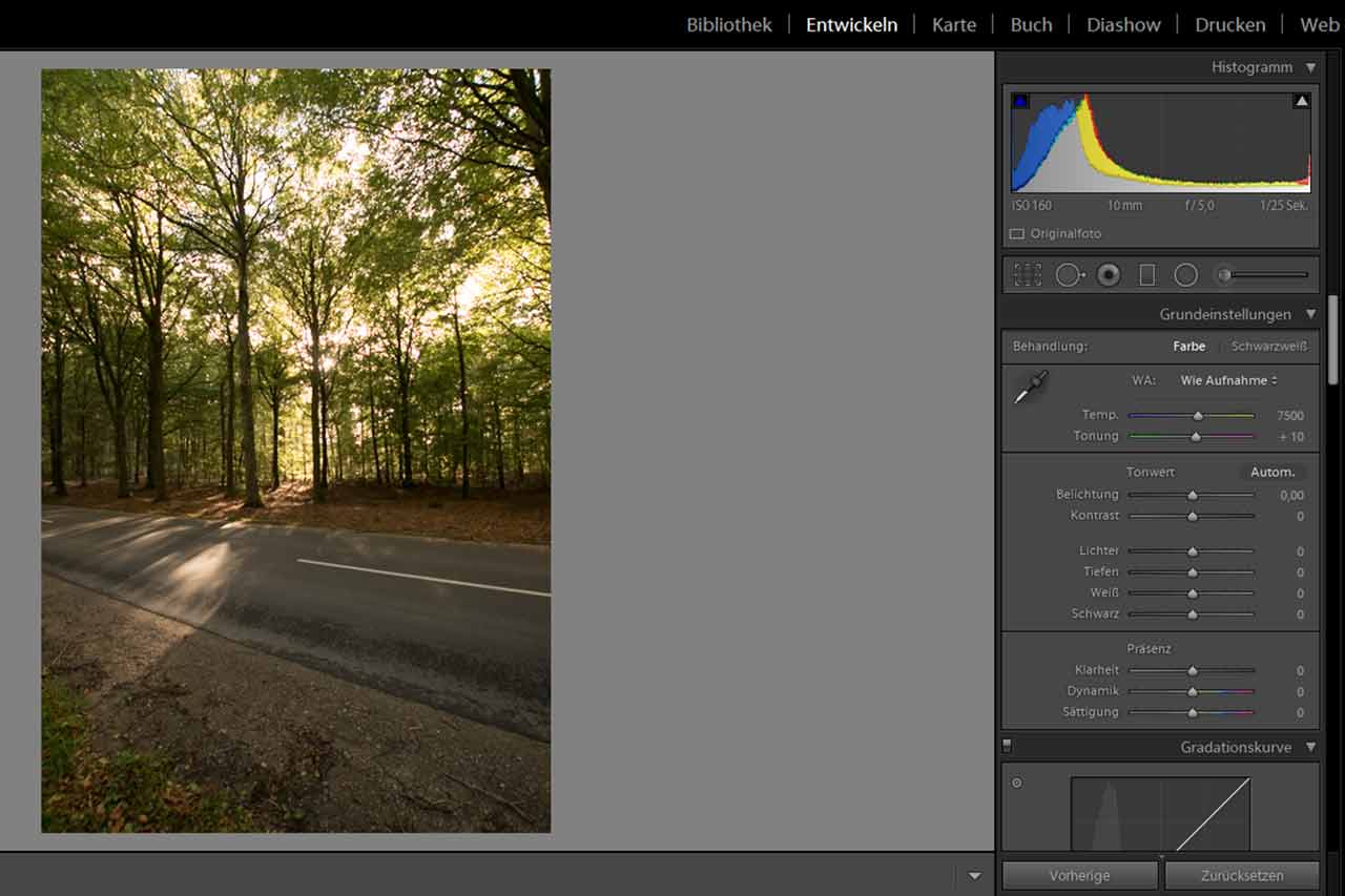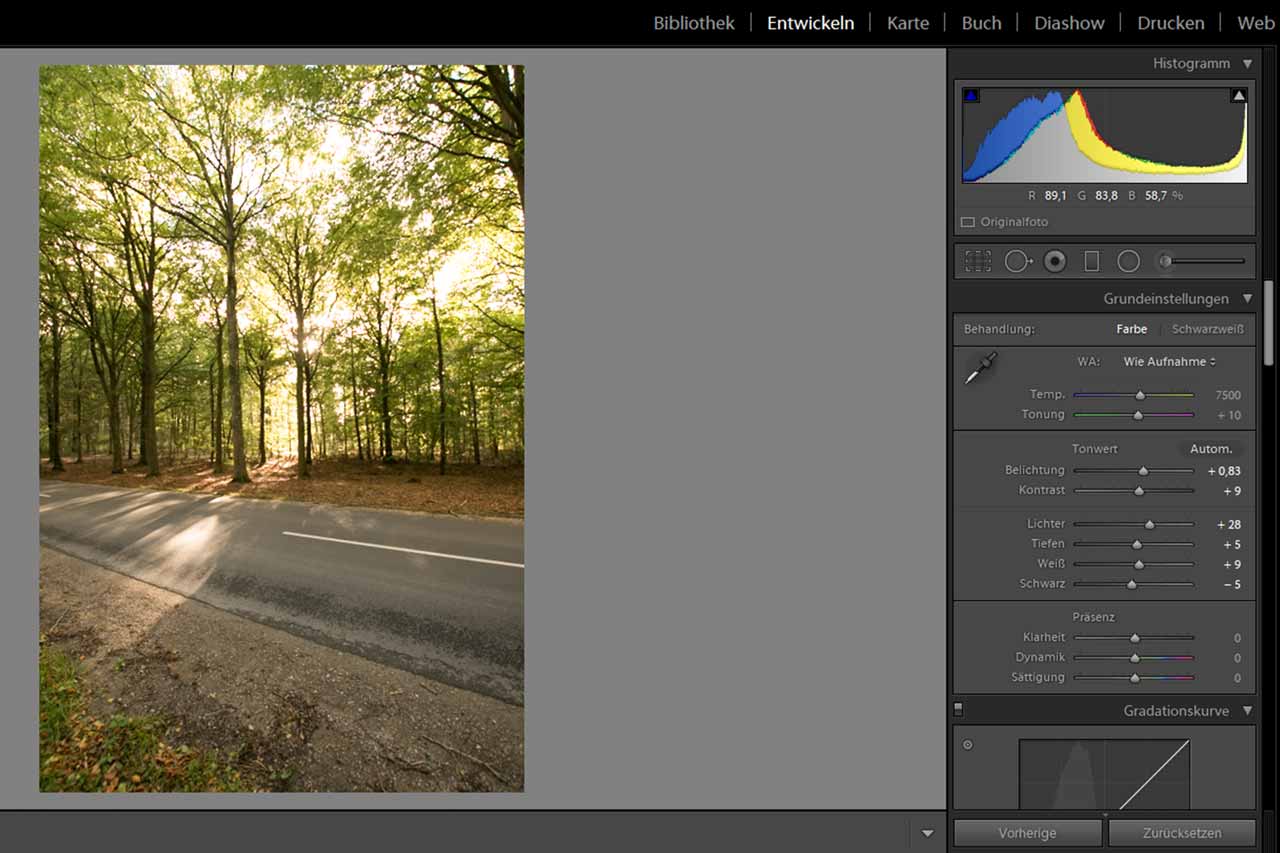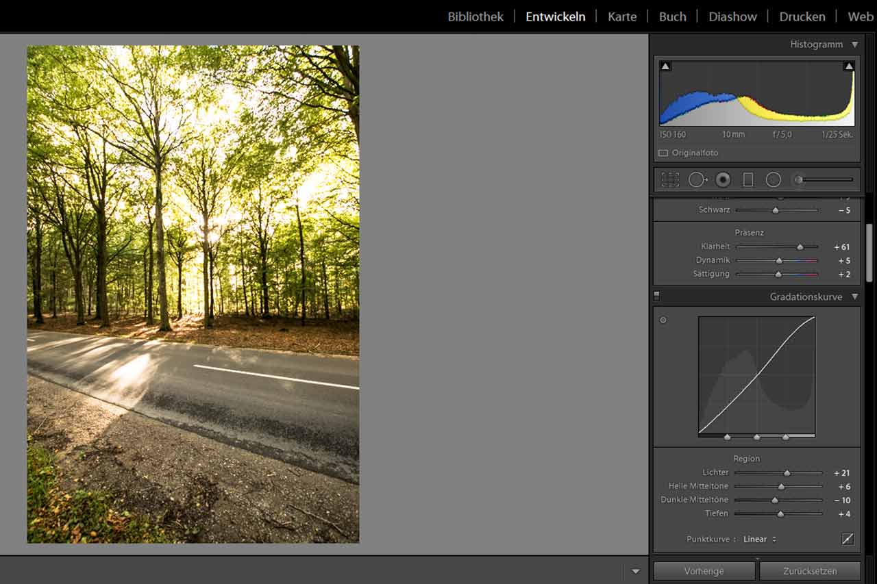 Nun kommt der entscheidende Punkt: die Gradationskurve anpassen. In diesem Beispiel werden die Highlights, sowie die hellen Mitteltöne etwas aufgehellt. Du siehst sofort, wie viel mehr Kontrast das durchscheinende Licht auf der Straße bekommt.