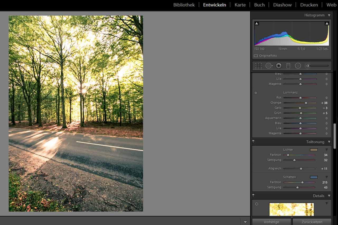 Die Farbtonung lässt dich dein Bild in zwei wesentliche Bereiche unterteilen. Helle und dunkle Flächen. Mit der Teiltonung kannst du nun diese Flächen in Abhängigkeit zueinander bearbeiten. Achte bei hellen Flächen immer darauf, dass sie etwas wärmer wirken, als der Rest deines Fotos.