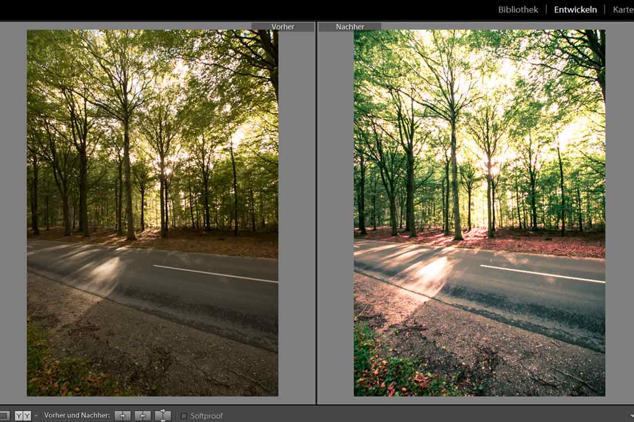 In diesem Schritt wird die Klarheit gesetzt. Der Unterschied ist deutlich zu sehen. Durch mehr Klarheit kommen komplexe Strukturen viel besser zum Vorschein. Die Linien und Muster in den Bäumen, aber auch die Gewächse entlang der Straße sehen deutlich greifbarer und realistischer aus.