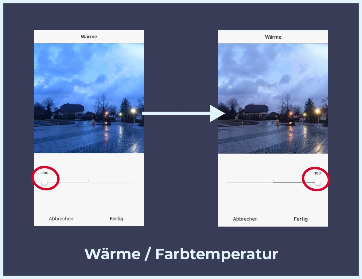 Mit der Wärme definierst du den Weißabgleich deines Fotos. Wärmer und kälter hat etwas mit der Farbtemperatur jeglicher Lichtquellen zu tun. Je „gelber“ das Bild ist, desto wärmer fühlt sich die Umgebung im Foto an.
