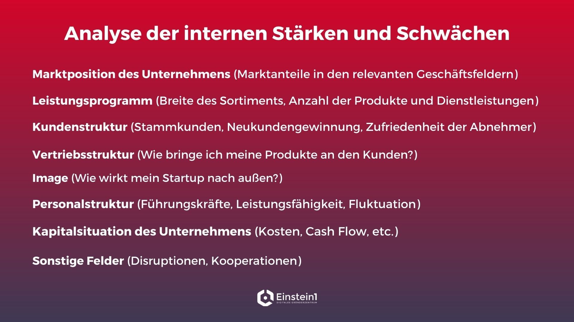 So kann man sein Unternehmen verbessern, vor allem im Bezug auf die Schwächen, die das Unternehmen am Markt hat oder interne Schwierigkeiten, die ein Risiko für den Geschäftsbetrieb sein können.